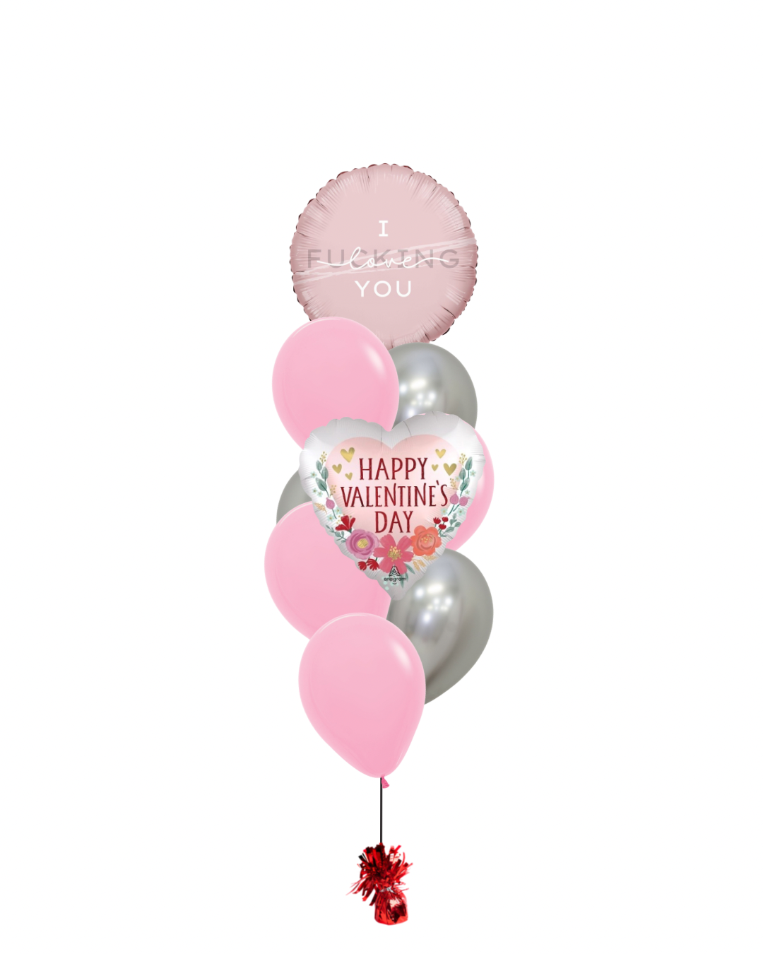 An arrangement of 7 premium quality 28cm latex helium balloons in fashion light pink and chrome silver, 1 I f**cking Love You 45cm foil balloon and 1 Happy Valentine’s Day 45cm Foil Balloon on a weight.