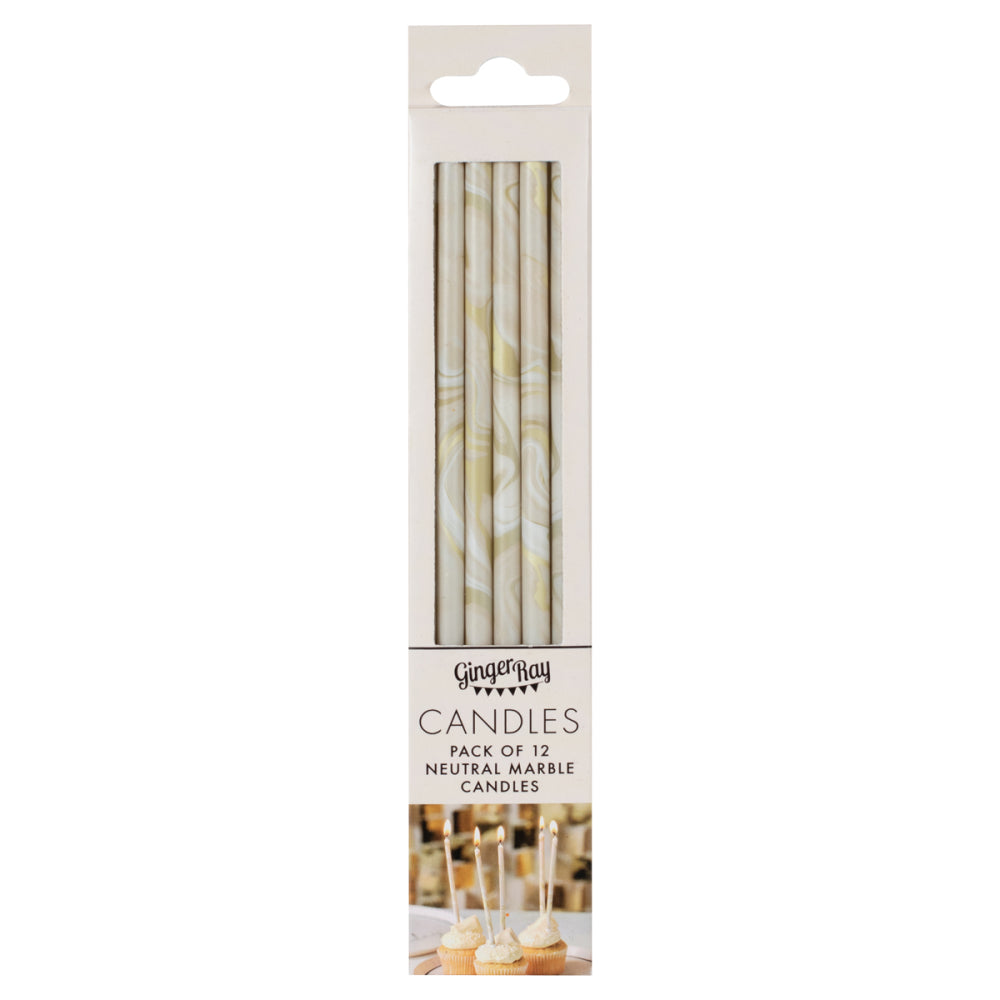 Pack of 12 Nude and Champagne Gold Tall Marble Birthday Cake Candles.