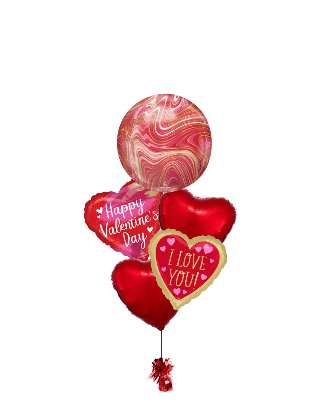 This helium filled arrangement includes:2 x red foil 45cm heart ballloons